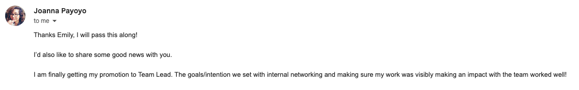 Within 3.5 months of working with Emily, I landed my first product role with a 31% salary increase and got fast-tracked for a team lead role.